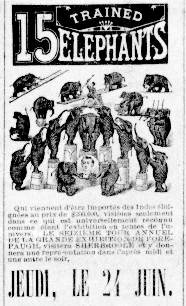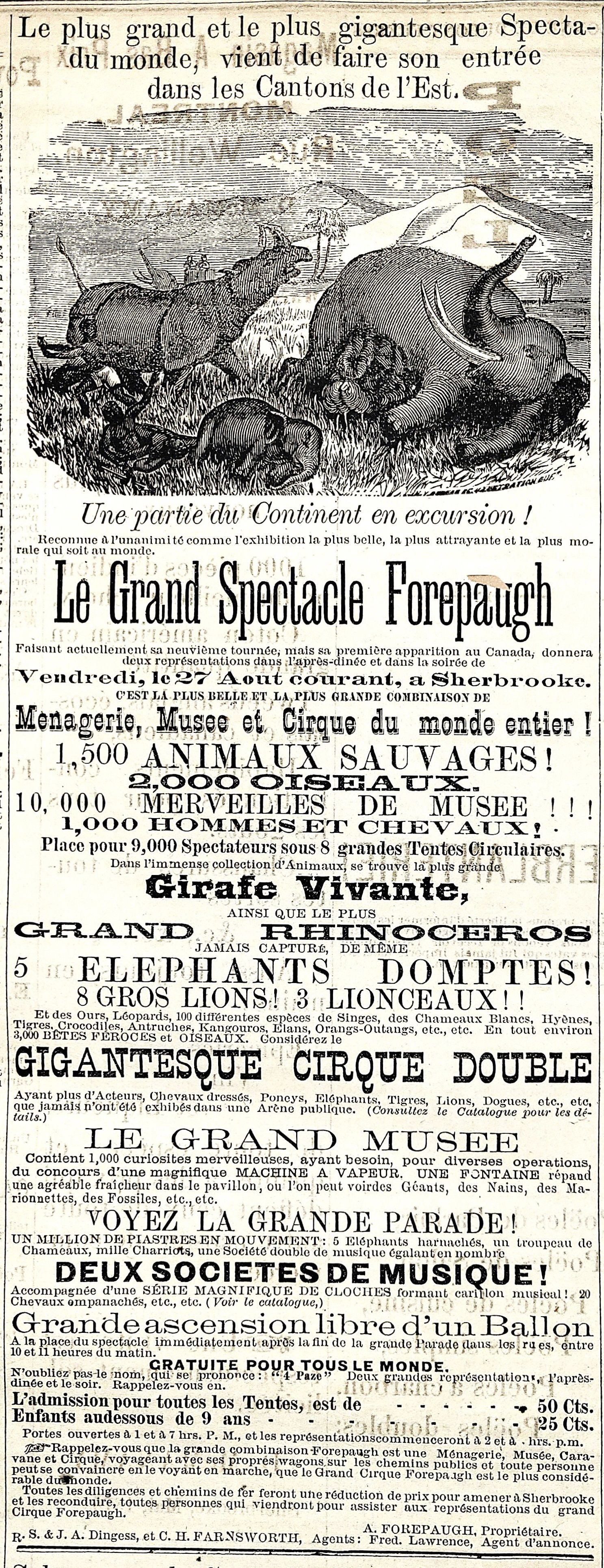 Durant l’été 1875, on annonce en grande pompe l’arrivée du très populaire cirque Forepaugh, en tournée au Canada. En perspective, de nombreuses espèces d’animaux (et de polices de caractère) pour un spectacle mettant en vedette humains, animaux et dernières technologies! (Photo Le Progrès de l'Est, 21 août 1875)