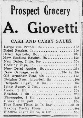 L’épicerie de A. Giovetti, désignée comme la «Prospect Grocery» en 1924, est déjà un magasin pourvu d’un inventaire varié, de la farine de blé aux ampoules électriques, en passant par les fruits et les légumes. (Photo Sherbrooke Daily Record, 3 juin 1924)
