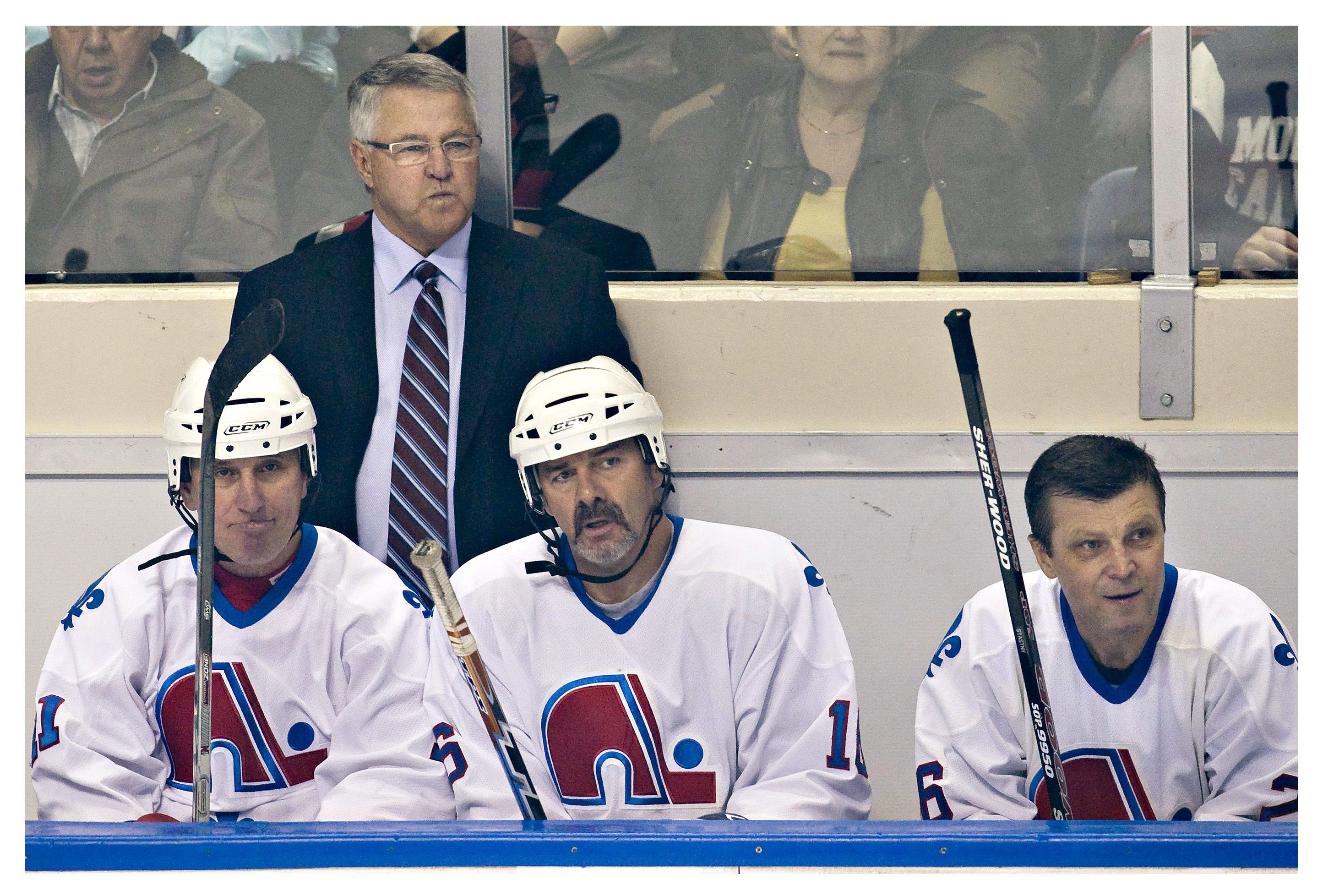 L'ancien entraîneur des Nordiques de Québec Michel Bergeron se tient derrière les joueurs André Savard, de la gauche, Michel Goulet et Peter Stastny lors d'un match amical des légendes du hockey avec les Canadiens de Montréal au Colisée de Québec, le samedi 13 mars 2010. (Photo archives PC, Jacques Boissinot)