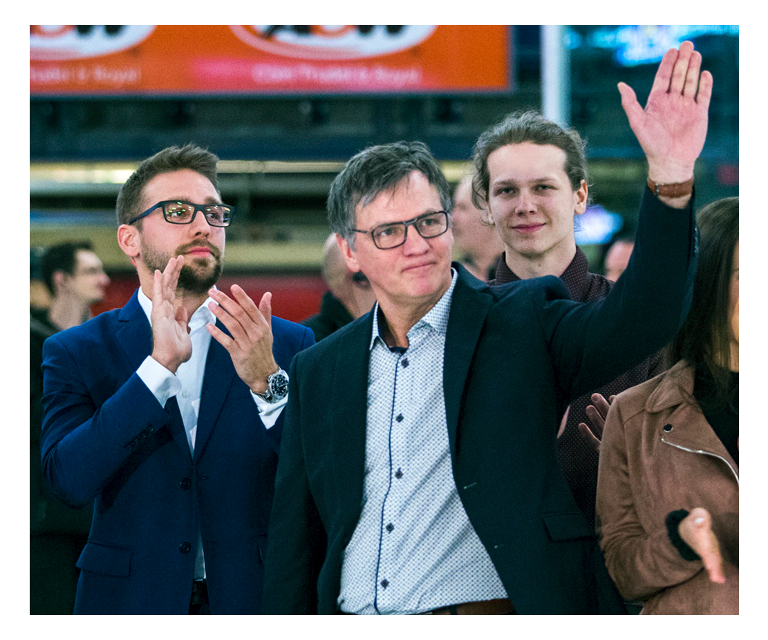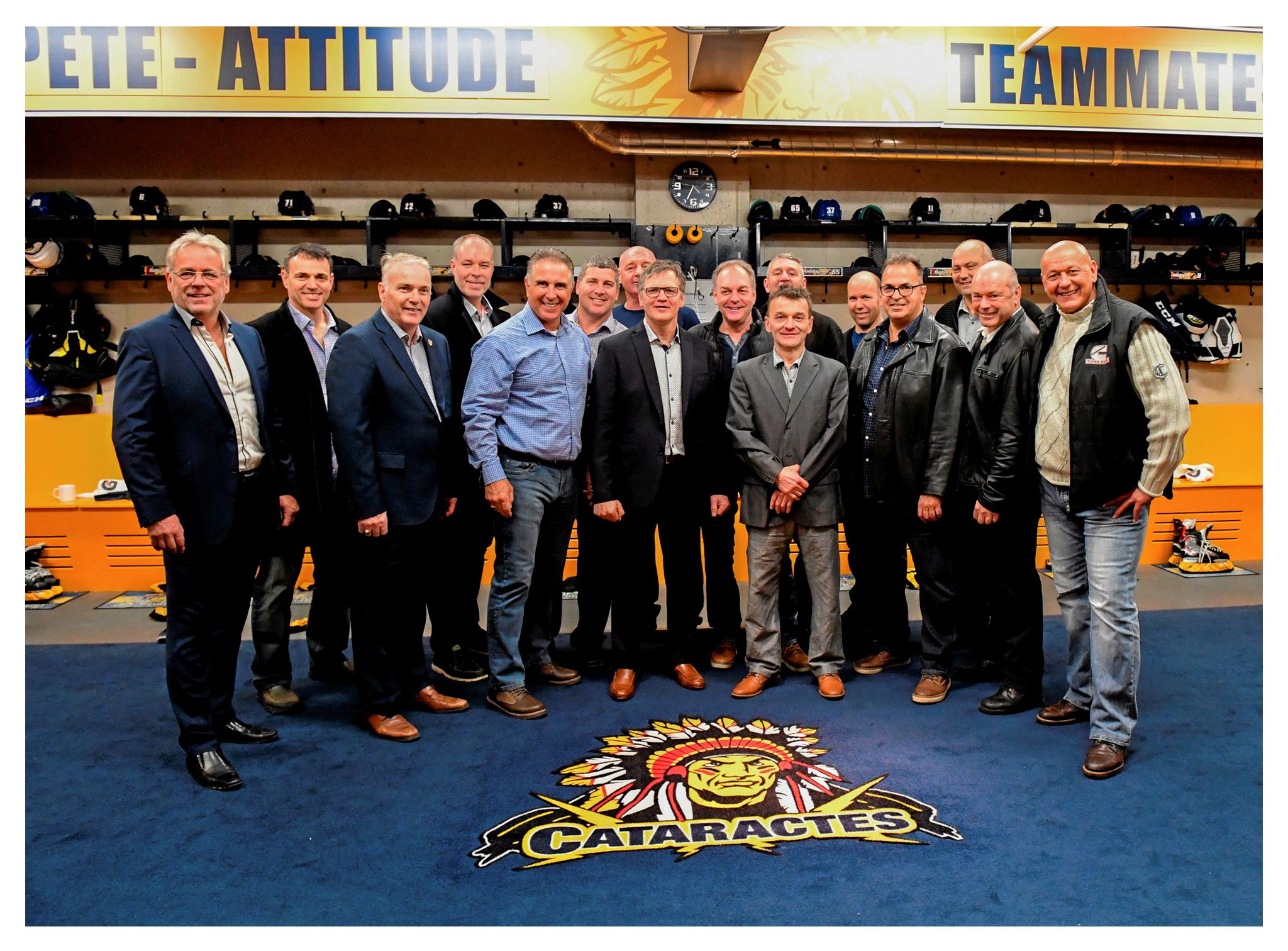 Le gilet du gardien Mario Gosselin, joueur-clé des Cataractes en 1982-1983, a été retiré par l’organisation en 2018. On le voit ici, au centre, entouré du président Roger Lavergne et de quelques-uns de ses anciens coéquipiers. (Photo Cataractes)