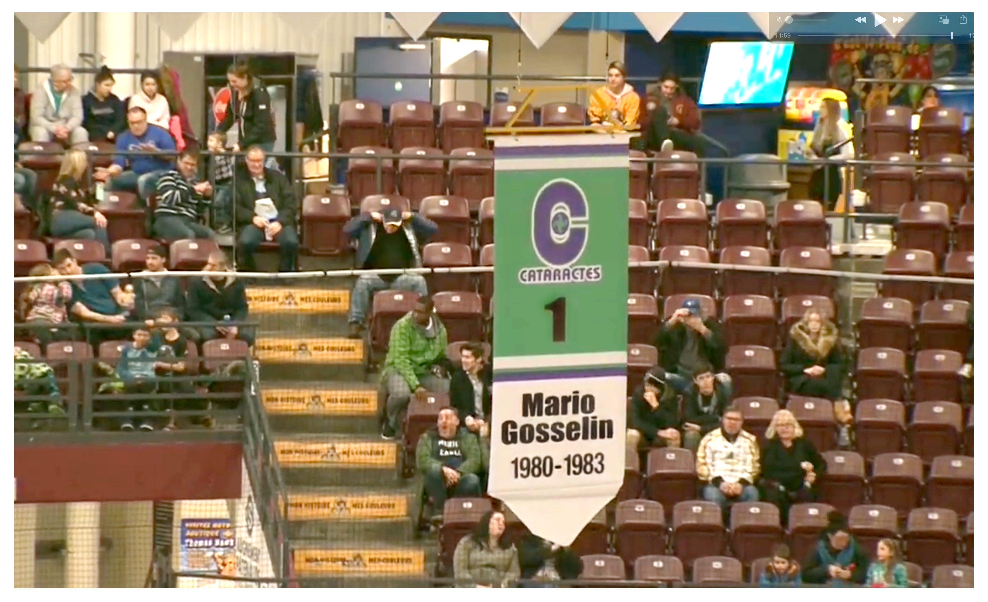 Signe de son impact important, Gosselin a le privilège de voir son numéro 30 flotter dans les hauteurs du Centre Gervais Auto depuis décembre 2018. (Photo tirée de YouTube)