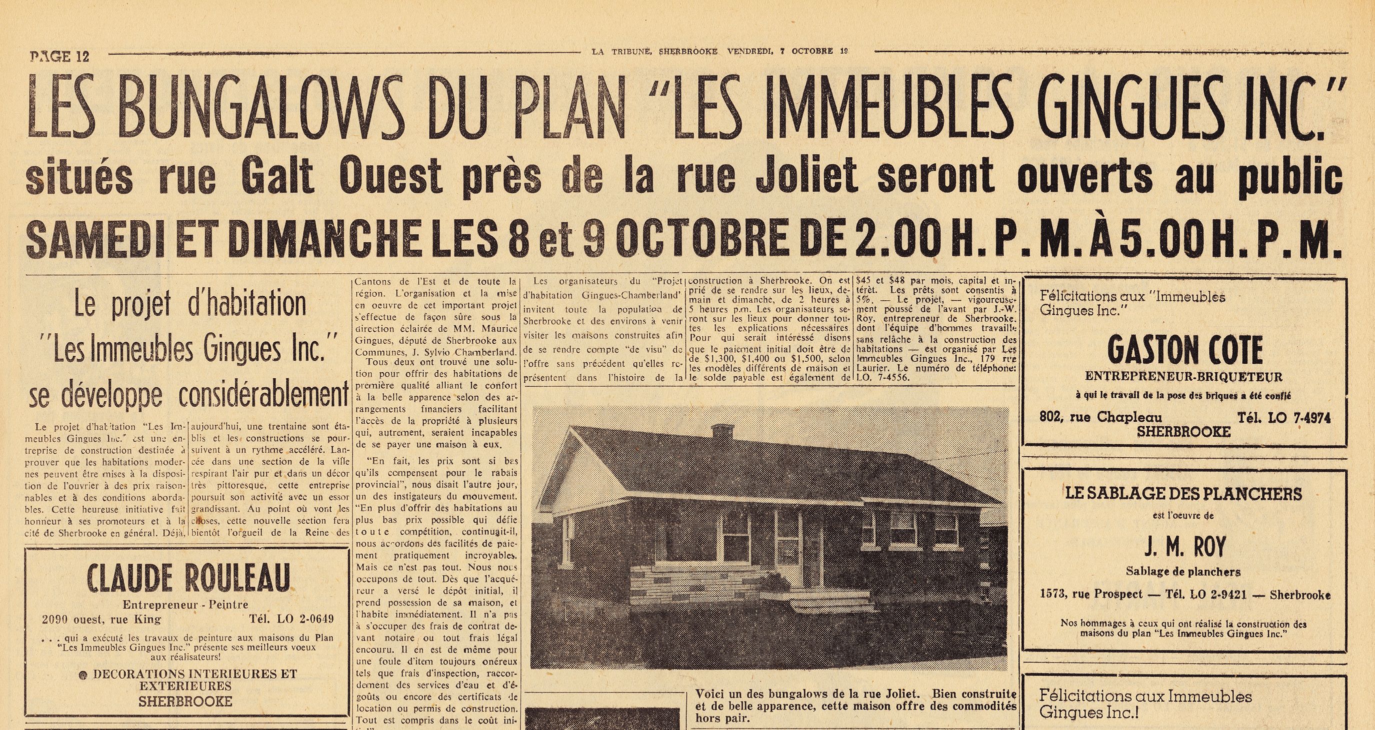 Le bungalow est le modèle de choix pour les nouveaux développements. Sur la rue Joliet, dans l’Ouest de la ville, plusieurs maisons du genre sont proposées par les Immeubles Gingues Inc., société dirigée par le député de Sherbrooke aux Communes, Maurice Gingues. (Photo La Tribune, 7 octobre 1955)