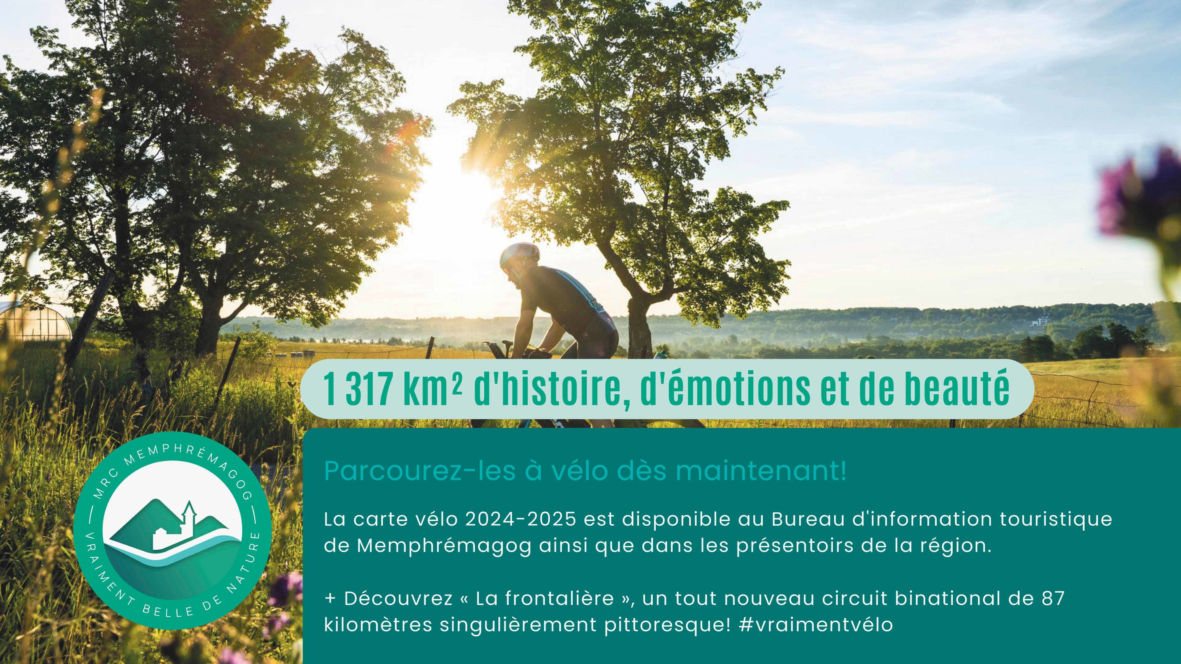 Cette initiative de la MRC Memphrémagog est une autre façon de mettre en valeur les richesses du territoire. L’outil web sera déployé vers la mi-juin sur le site memphremagogvraiment.com et sera évolutif. Conçu pour votre plaisir, il regorgera d’informations : bonnes adresses, liste des sentiers pédestres et des pistes cyclables, etc. Les circuits de la carte vélo, mise à jour annuellement par la MRC, s’y trouveront en mode téléchargeable de même que le contenu de la carte Virée du lac Memphré qui vous incitera à parcourir tout le lac Memphrémagog jusqu’à Newport aux États-Unis.