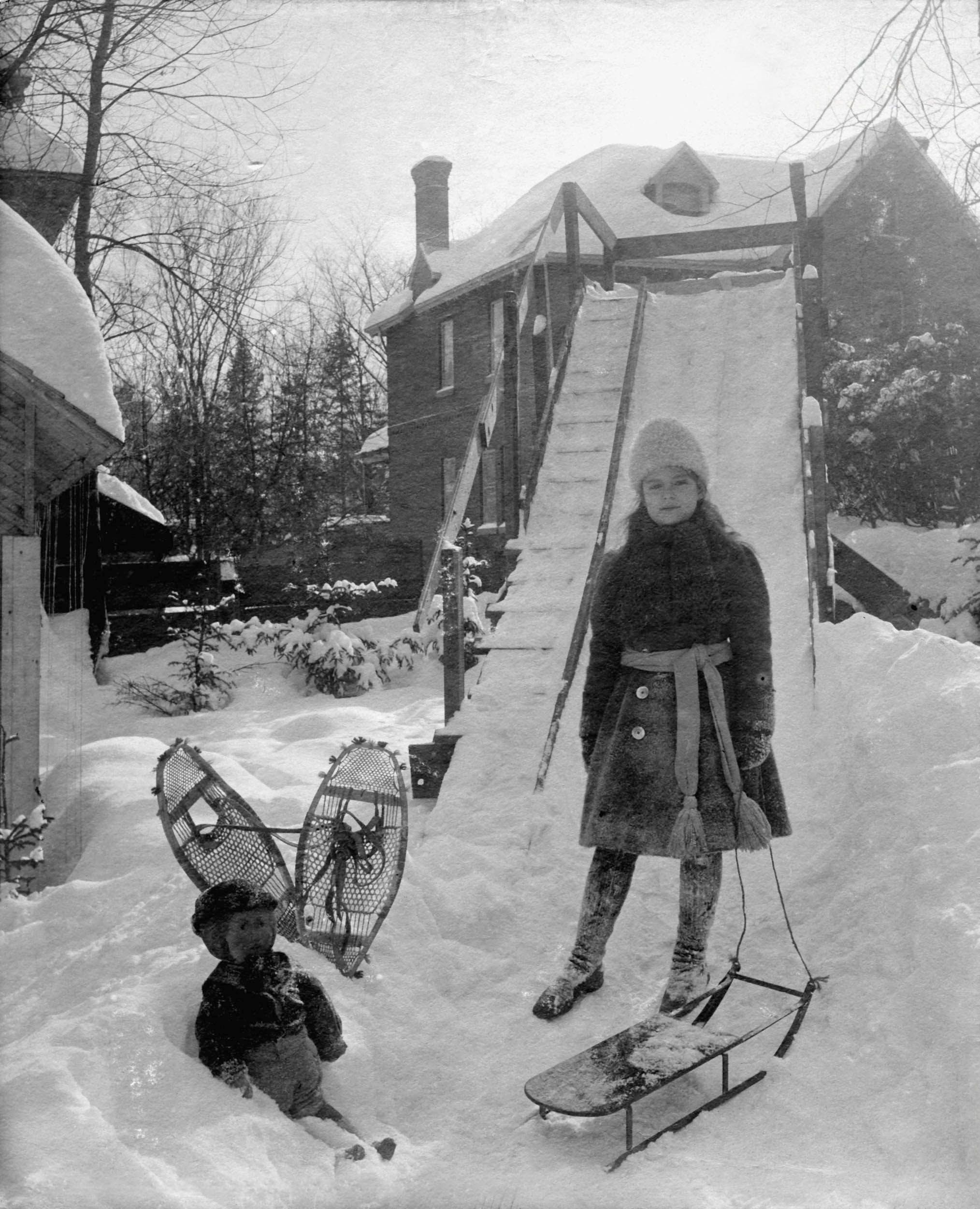 Gladys Day Worthington, âgée d’une dizaine d’années, profite de la neige recouvrant une glissoire en bois, vers 1905. (Photo Fonds Famille Worthington, Mhist)