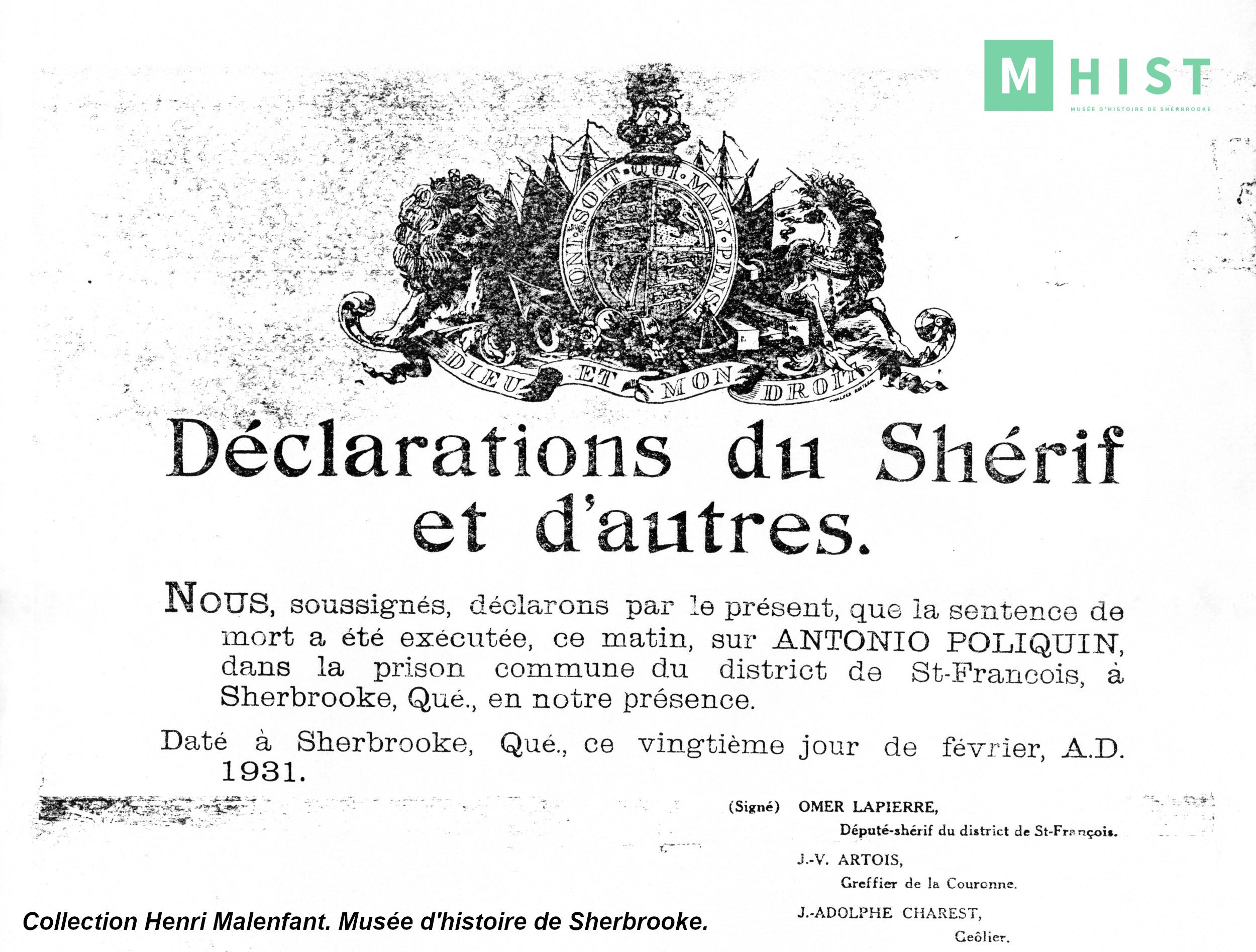 Extrait d’archives sur l’exécution d’Antonio Poliquin en février 1931. (Photo Collection Henri Malenfant, Musée d’histoire de Sherbrooke)