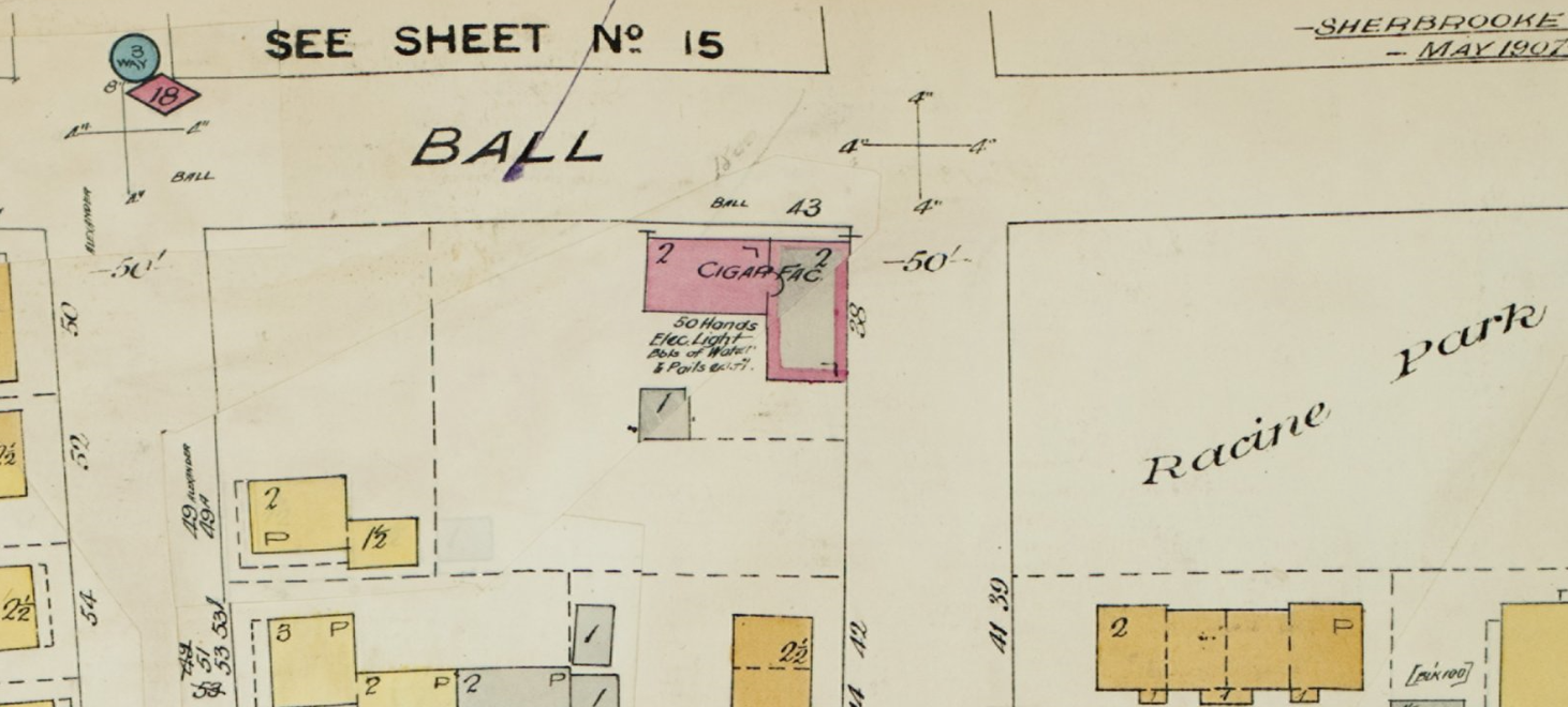 La Sherbrooke Cigar Company, lancée au début du 20e siècle, prend ses quartiers sur la rue Ball. (Plan d’assurances de 1907, revue en 1917)