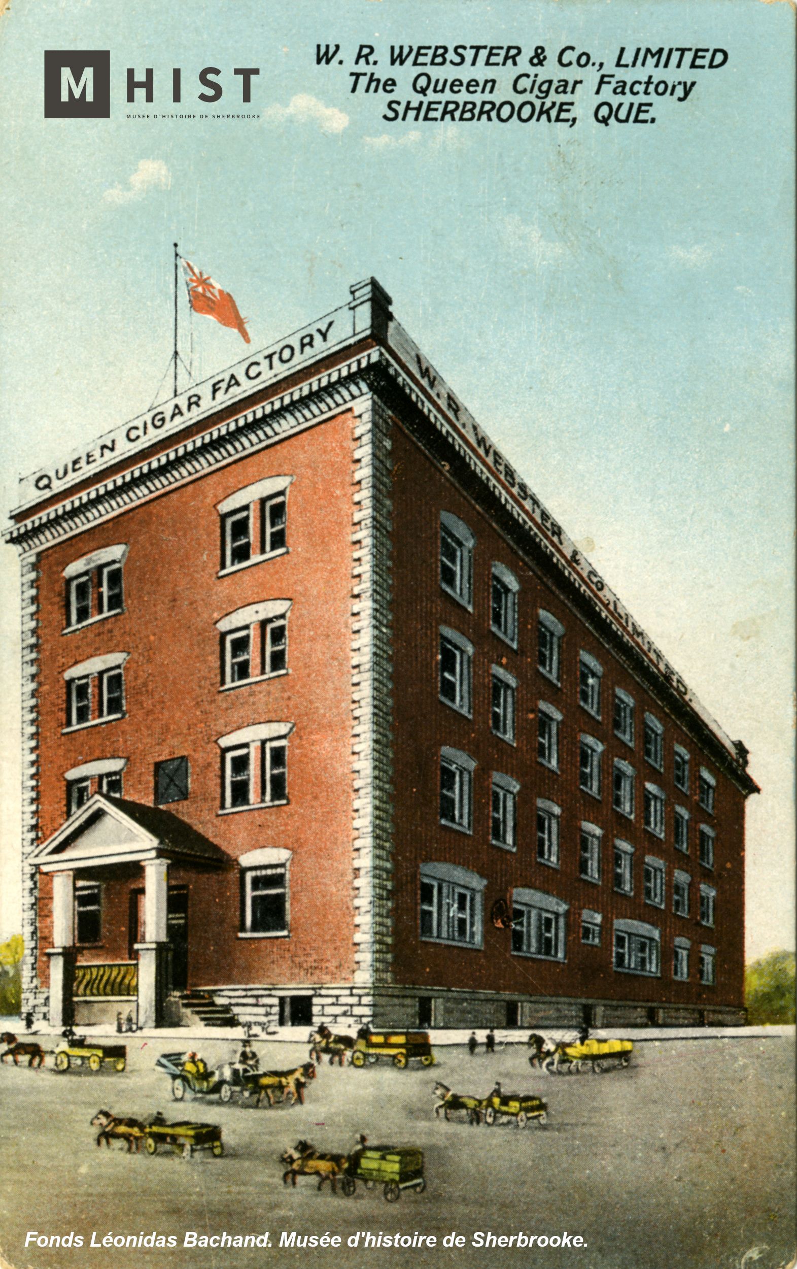 L’édifice de la W.R. Webster and Co. Limited, siège de la Queen Cigar Factory, représenté ici vers 1910. L’immeuble est toujours présent au coin des rues Webster et Meadow. (Photo, Fonds Léonidas Bachand, Mhist)