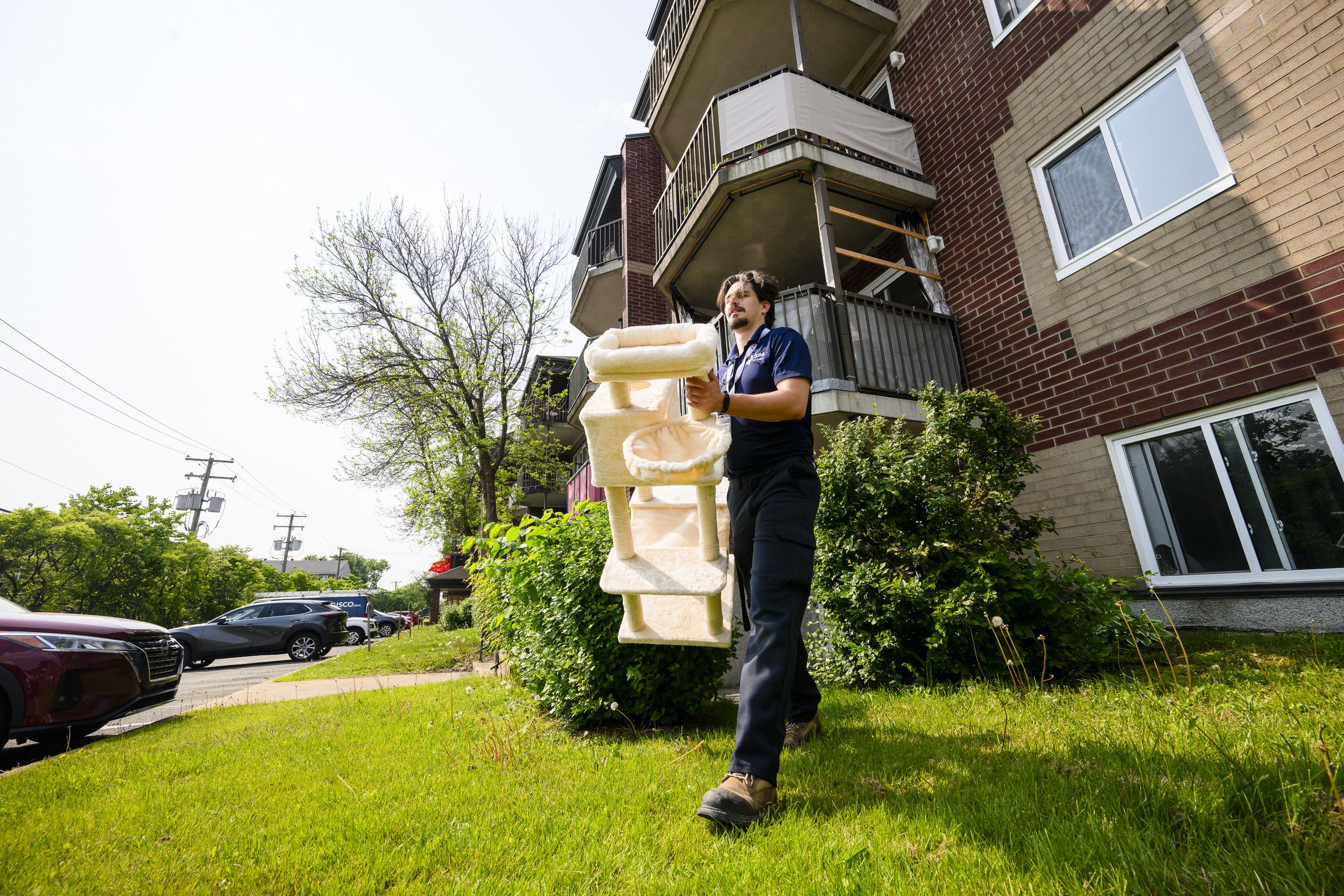 «Cherchez-vous une moufette? Elle est là-bas, en dessous du cabanon!» lui lance une vieille dame croisée en arrivant dans le stationnement de l’immeuble où il doit récupérer un arbre à chat de six pieds et des accessoires d’un félin récemment donné à la SPA.