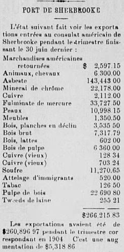 On retrouve pendant plusieurs années, dans les journaux locaux, les bilans annuels des exportations enregistrées au consulat de Sherbrooke. (Photo Le Progrès de l’Est, 7 juillet 1905)