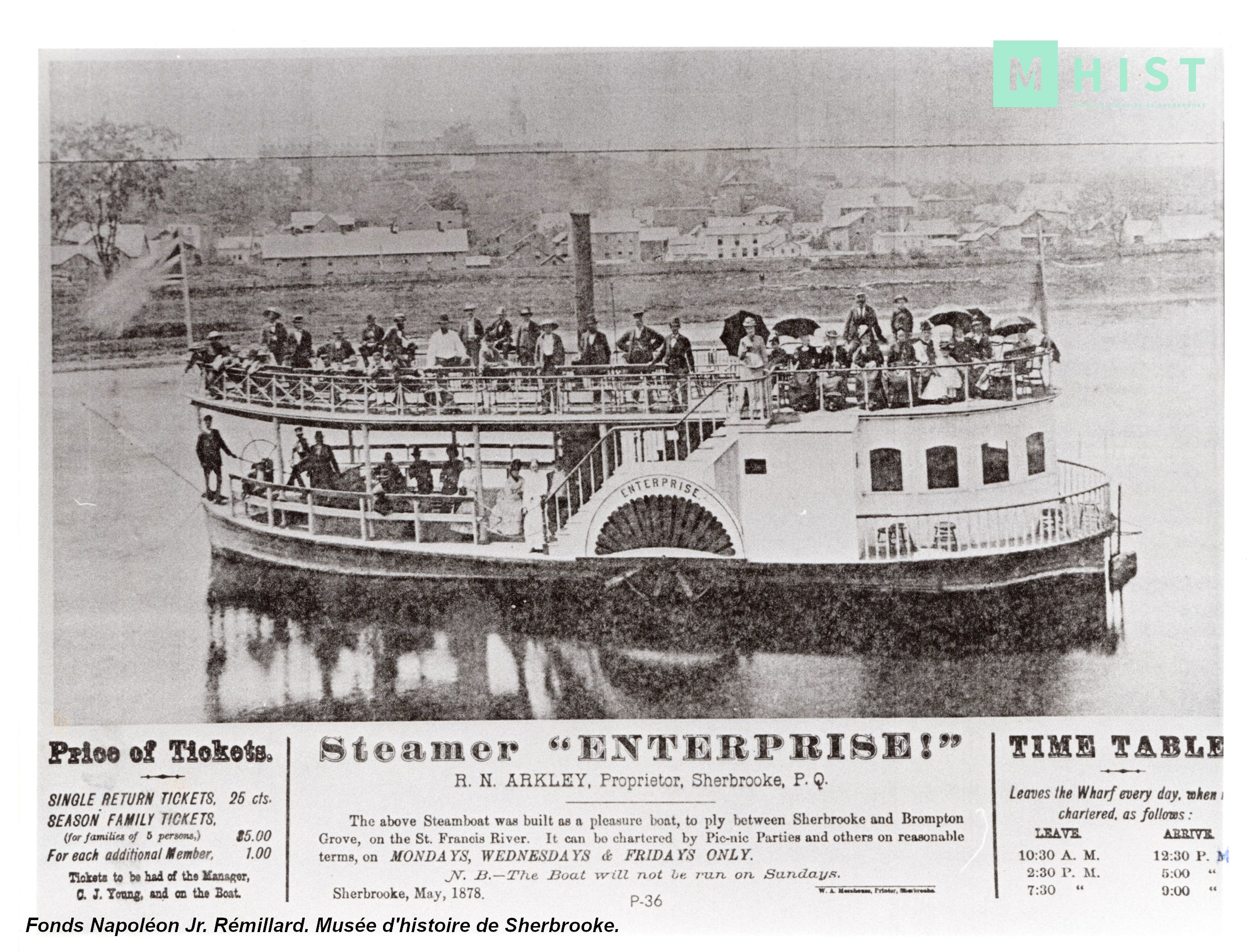 Quelques semaines plus tard, le 18 mai 1878, est inauguré le premier bateau à vapeur à sillonner les eaux de la Saint-François! C’est le début de l’offre de croisières sur la Saint-François. Ce jour-là, quelque 140 passagers embarquent pour une excursion entre Sherbrooke et Lennoxville.