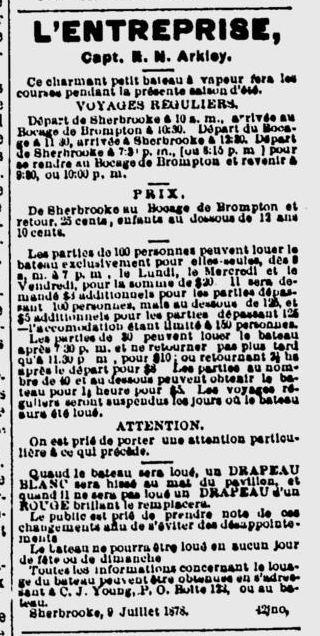 Ceci va changer au printemps 1878, alors que l’on annonce dans le journal que monsieur Robert N. Arkley est en train de faire construire un petit bateau à vapeur…