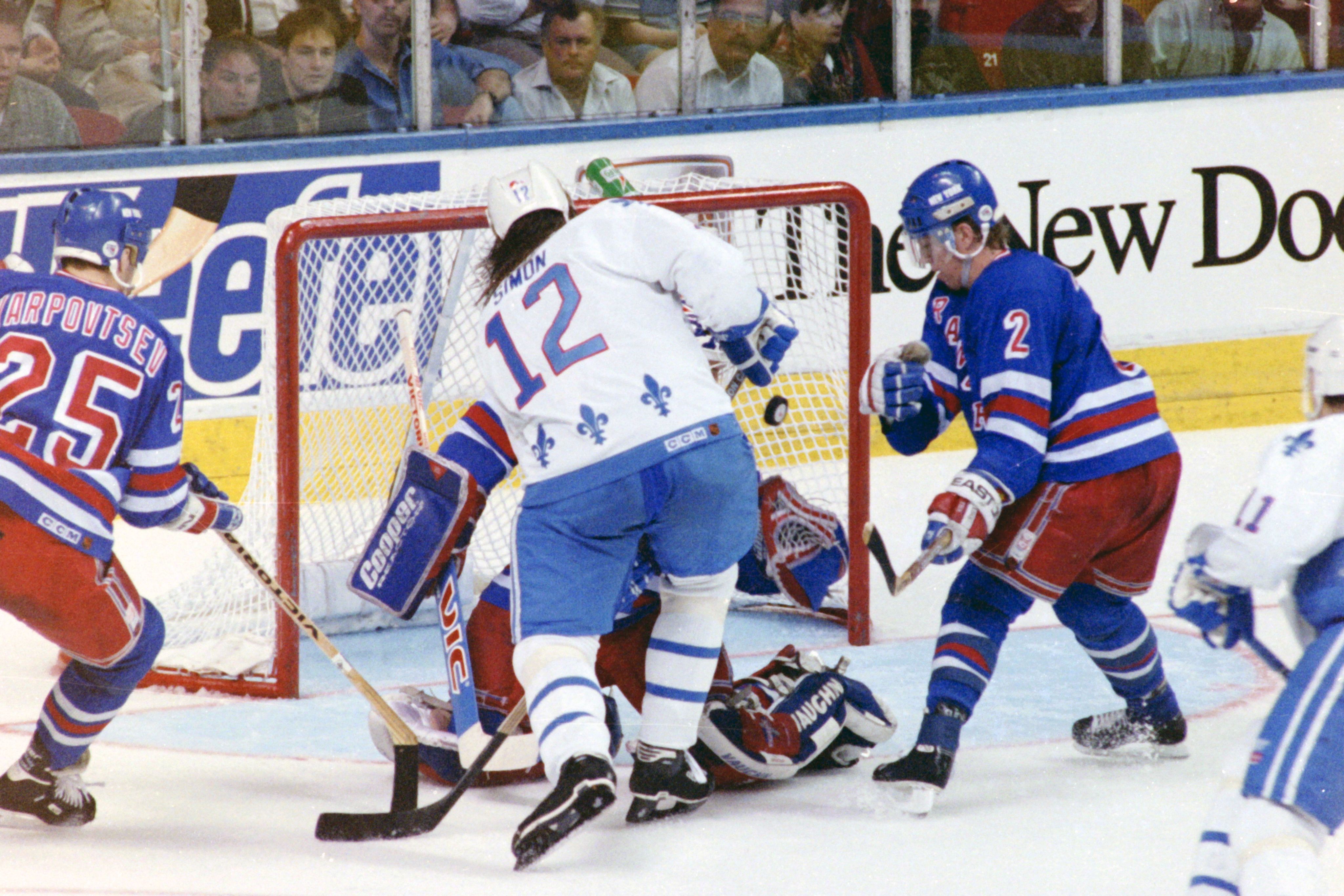 Chris Simon des Nordiques marque un but dans le cinquième match de la série contre les Rangers de New York, le soir du 14 mai 1995, le dernier de l'histoire des Bleus à Québec. (Archives Le Soleil/Patrice Laroche)