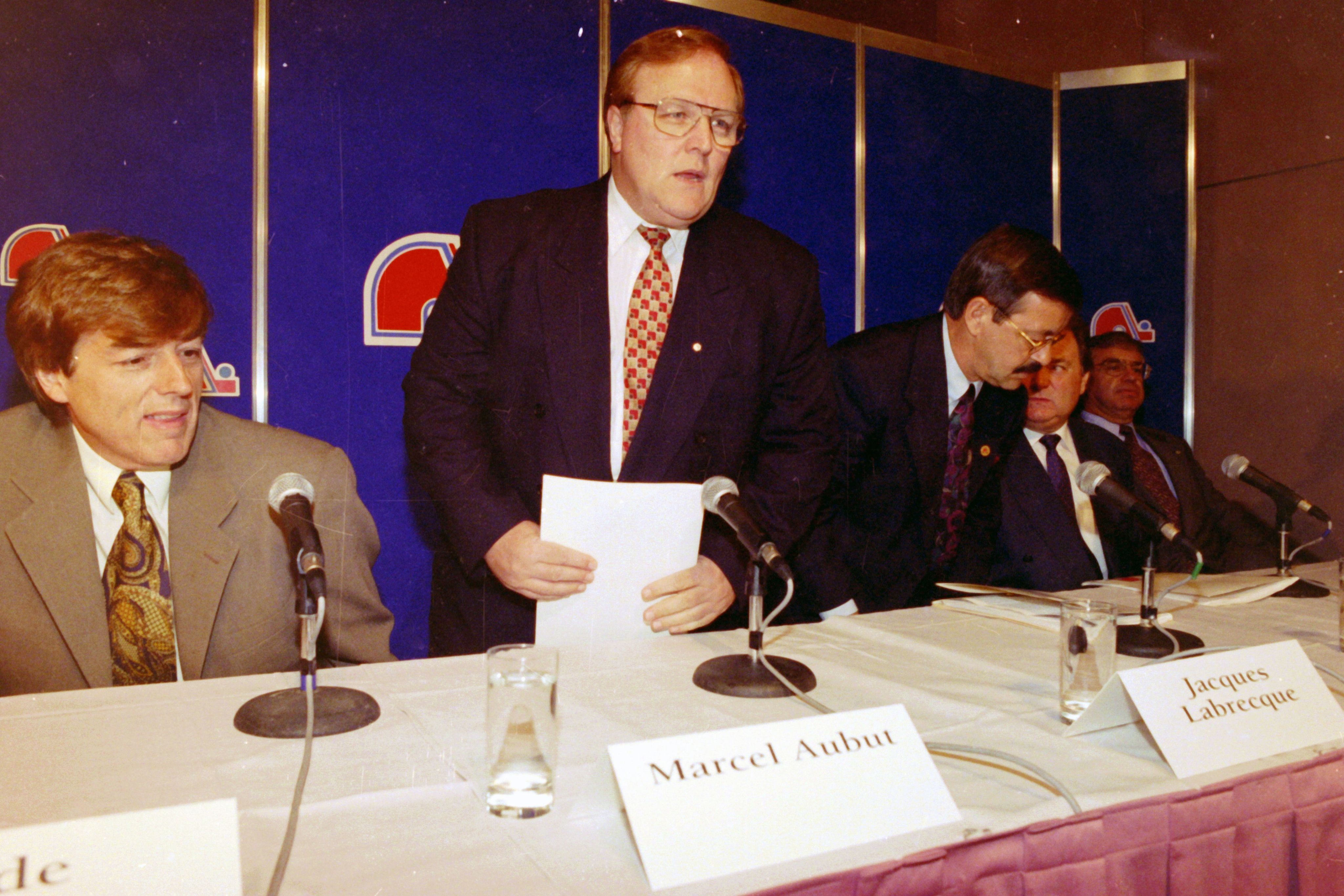 Le souffle court, Marcel Aubut tremble comme une feuille en lisant l’allocution de l'annonce fatidique. «La vente des Nordiques, soupire-t-il, je le comprends plus que quiconque, a de quoi rendre triste et morose…»