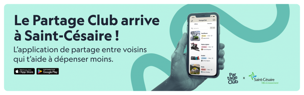 Sécuritaire et facile à utiliser, l’application mobile Partage Club vous fera économiser et rencontrer vos voisins. Vous êtes tenté par cette offre? Vous n’avez qu’à suivre les étapes énumérées sur le site de la Ville de Saint-Césaire pour adhérer à Partage Club.