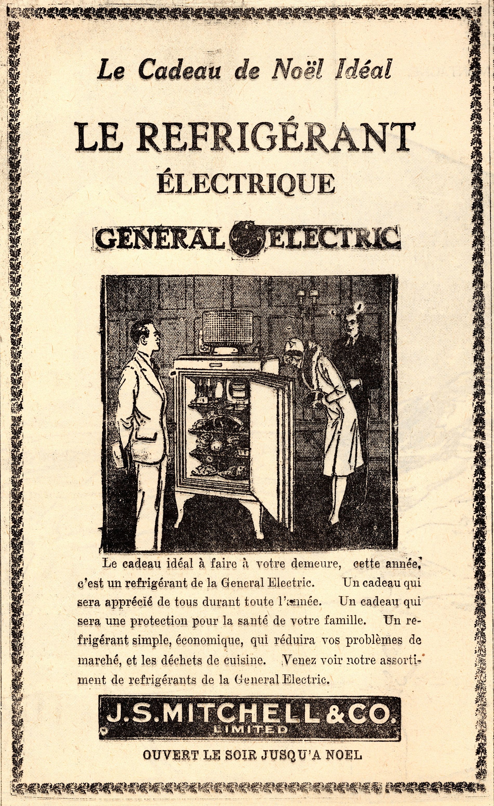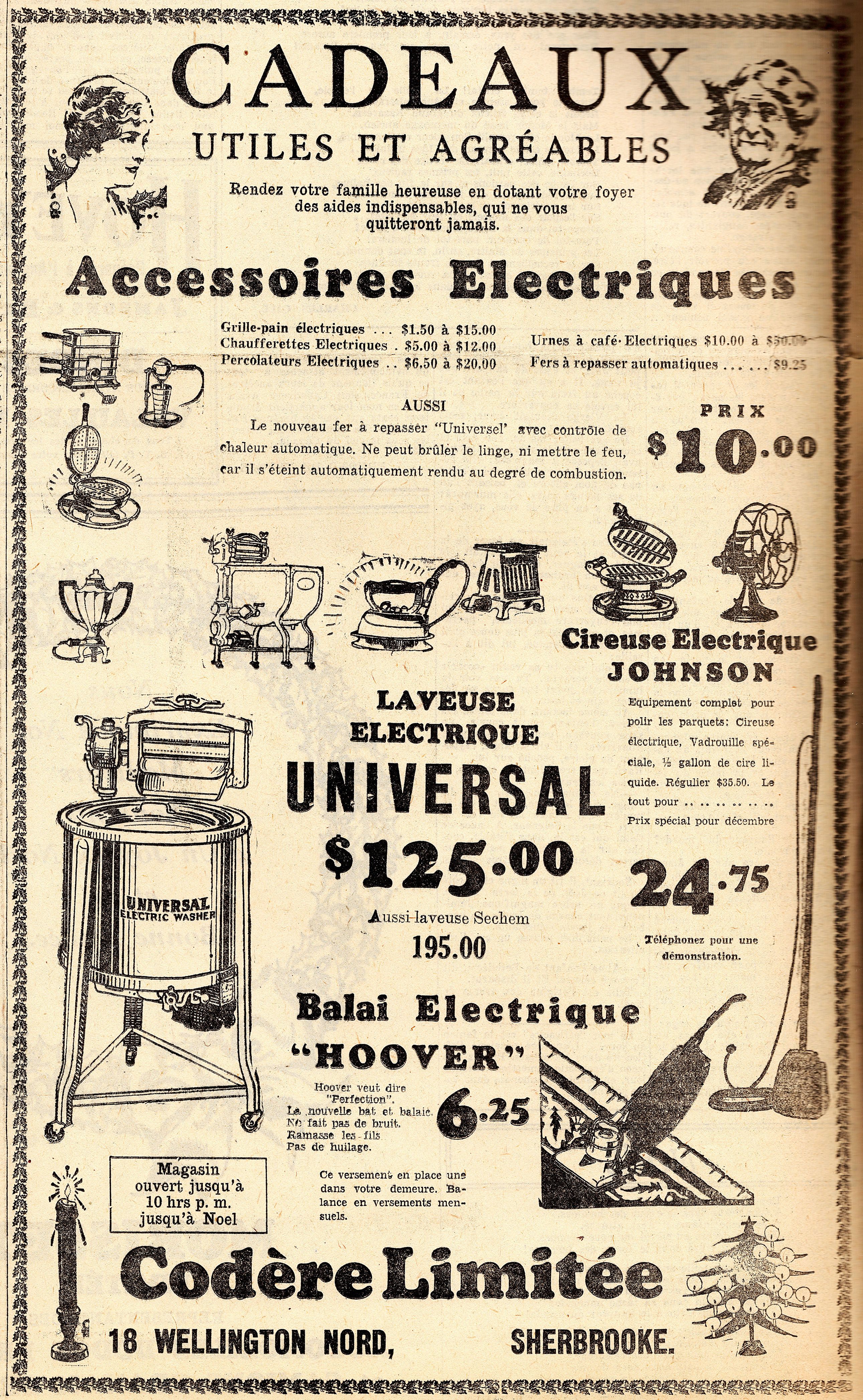 Derrière ce vaste choix d’appareils se cache un nom illustre des commerces sherbrookois: Codère. D’abord propriétaire d’une forge (1862) puis d’une ferronnerie (1877) au centre-ville, l’enseigne de magasin Cie Codère et Fils inc. naît en 1908. En tout, cinq générations de Codère tiennent le commerce jusqu’en 1971. (Photo La Tribune, 19 décembre 1928)