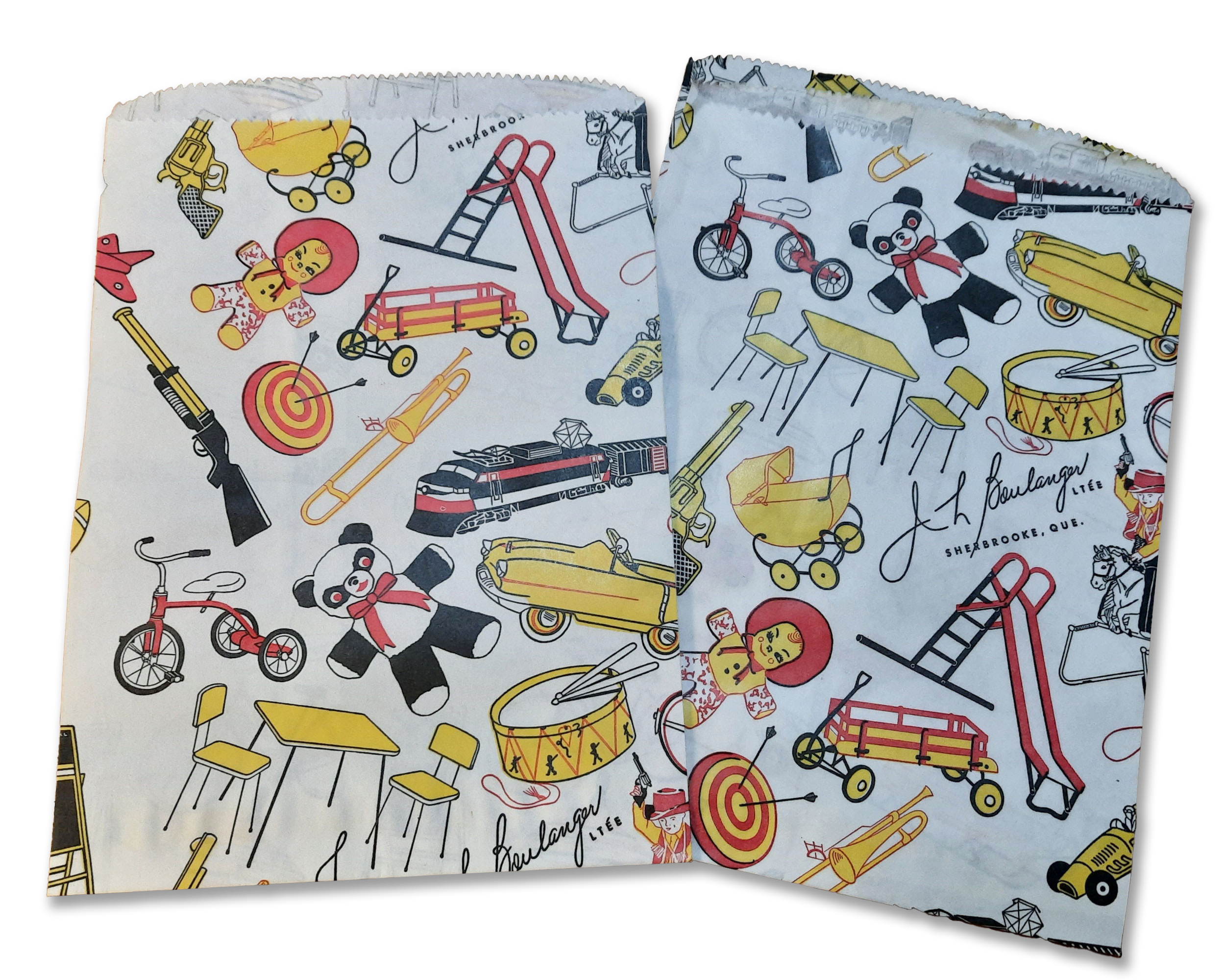 Ces sacs d’emballage en papier signés J.-L. Boulanger rappellent assurément des souvenirs à une génération de Sherbrookoises et Sherbrookois. (Photo Fonds Henri Z. Boisvert, Musée d’histoire de Sherbrooke)